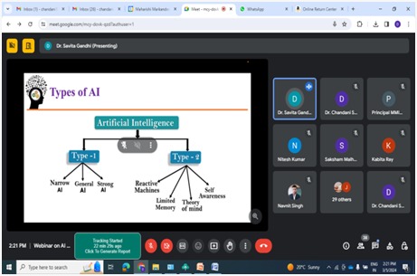 MMICTBM organized Webinar on “Foundations of AI and Data Science” on 05-03-2023, from 02:00 pm onwards conducted in hybrid mode through Google Meet. Dr. Savita R. Gandhi, Ex- Professor and Head, Dept of Computer Science, Gujarat University, Senior Member IEEE, Ahmedabad, Gujarat, served as the resource person. The event began with an opening address from Principal Dr. Sumit Mittal and an introduction by Dr. Chandani Sharma. Dr. Gandhi covered various aspects of AI and Data Science, including history, types, applications, and live examples. The webinar explored trends in Data Science, including data mining and analytics tools. Attended by MCA 2nd and 4th-semester students, along with faculty members, and online participants, the total attendance reached 182 students and 08 faculty members. The event was deemed well-attended and insightful.