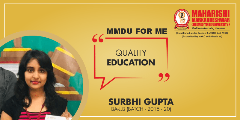 I am Surbhi Gupta, aged 20 years, student of B.A.LLB (4th Year) of Maharishi Markandeshwar (Deemed to be University), Mullana and resident of Kurukshetra, Haryana. The goal of my life is to become a successful person and contribute to the world through social activities as well. I aim to create awareness among people about their Rights & Duties and the laws that govern the nation. My hobbies are Dancing, Playing, Reading, Presentation, Leadership, etc.